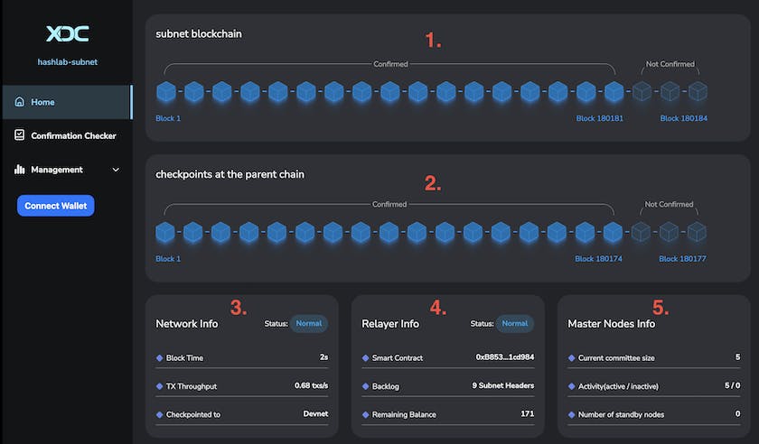 The Subnet Monitoring UI is a visual dashboard tool that allows developers to track the performance, health, and validator activity of their XDC Subnets in real time. It displays key metrics such as block production, finality status, anchoring checkpoints, and node uptime, helping teams quickly identify issues or confirm smooth operation. By providing a ready-to-use interface, this tool saves development resources—eliminating the need to build custom monitoring systems from scratch. It is especially valuable for teams deploying private, permissioned, or anchored subnets that need operational transparency and ease of maintenance.