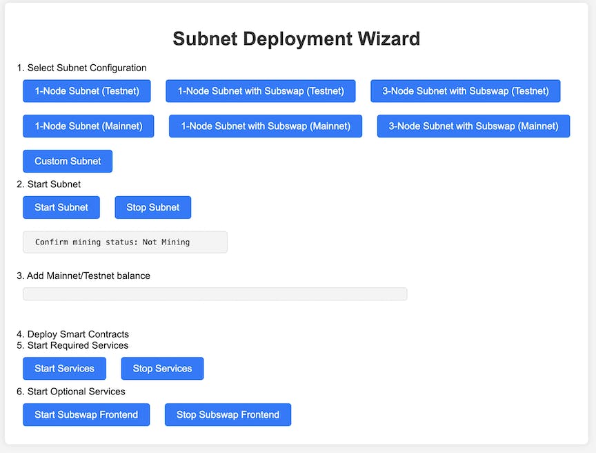 The subnet generator UI simplifies the deployment process, making subnets accessible to users without significant development experience. The deployment generator provides customizable selections such as epoch length, token distributions, master node count, rewards, and many others. The ability to deploy your subnet as a fully private blockchain or interoperate with the mainnet is available with this tool.
